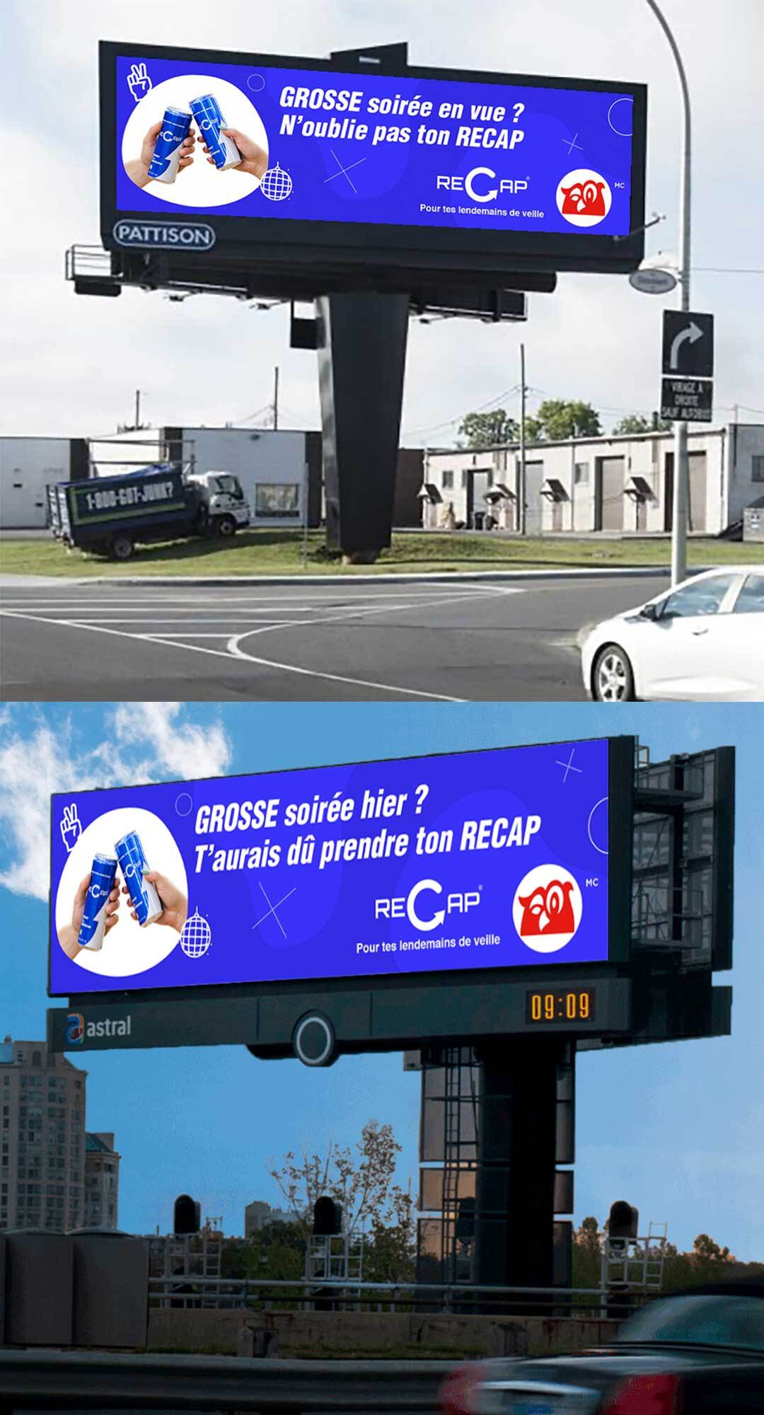 Campagne d’affichage numérique extérieur numérique déployée dans les universités, CEGEPs, restaurants, bars, billboards et abris-bus à travers le Québec afin d’augmenter la visibilité de la marque dans une sélection d’emplacements que fréquentent régulièrement la cible de RECAP; les étudiants et jeunes professionnels ayant une vie active.